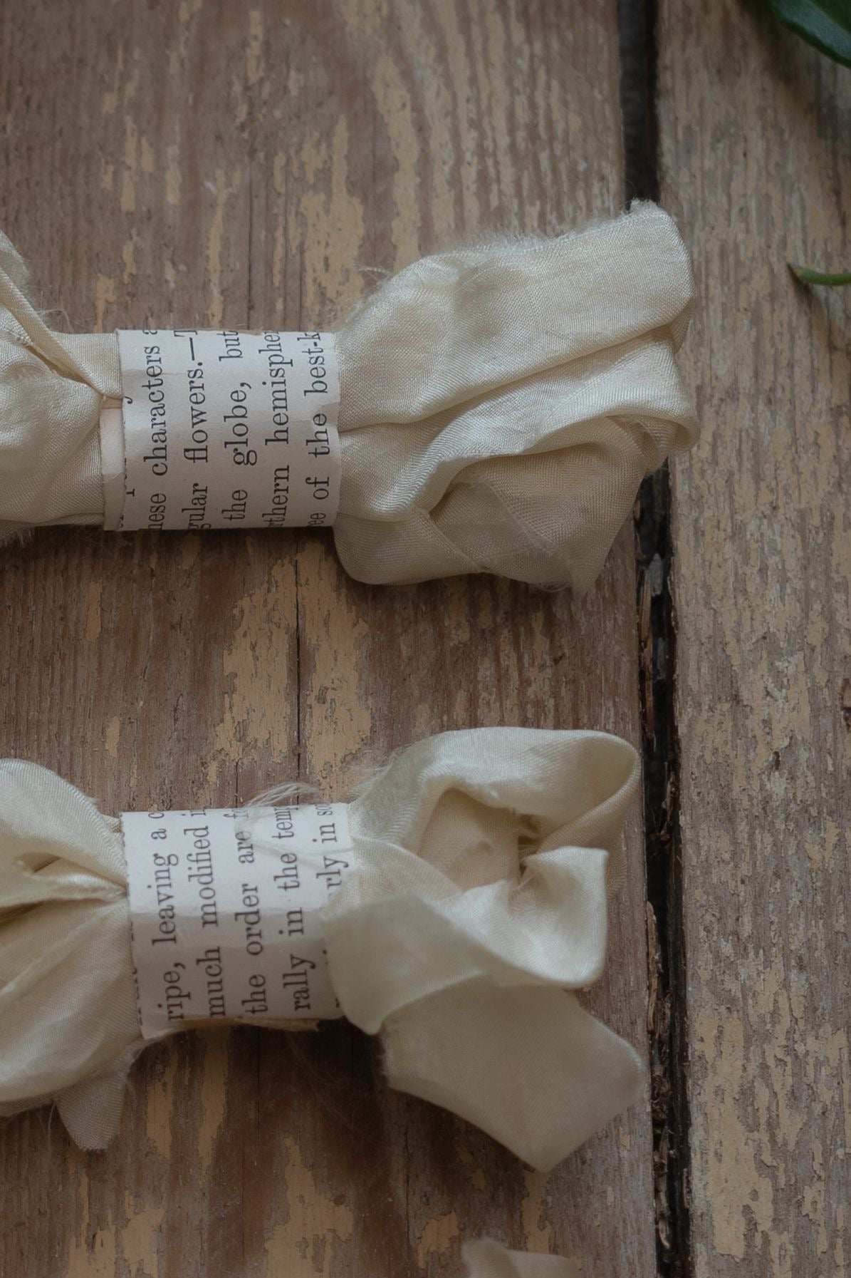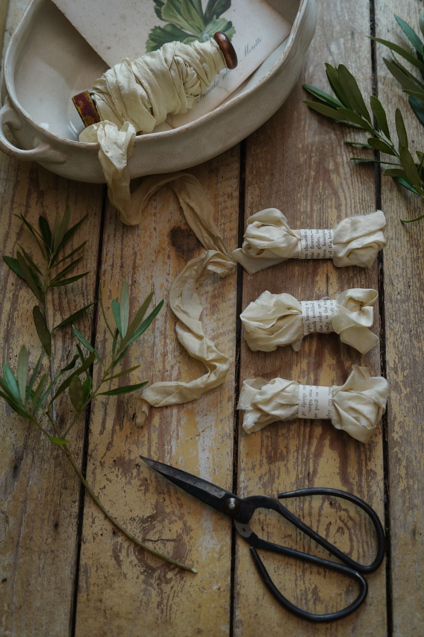 Flori and Moss creates, uses and sells our own carefully chosen selection of naturally hand dyed silk torn ribbons. The gentle natural tones achieved from using botanical materials complement beautifully the flori and natural wreaths we create. A real touch of luxury that is 100% natural and a perfect finishing touch.